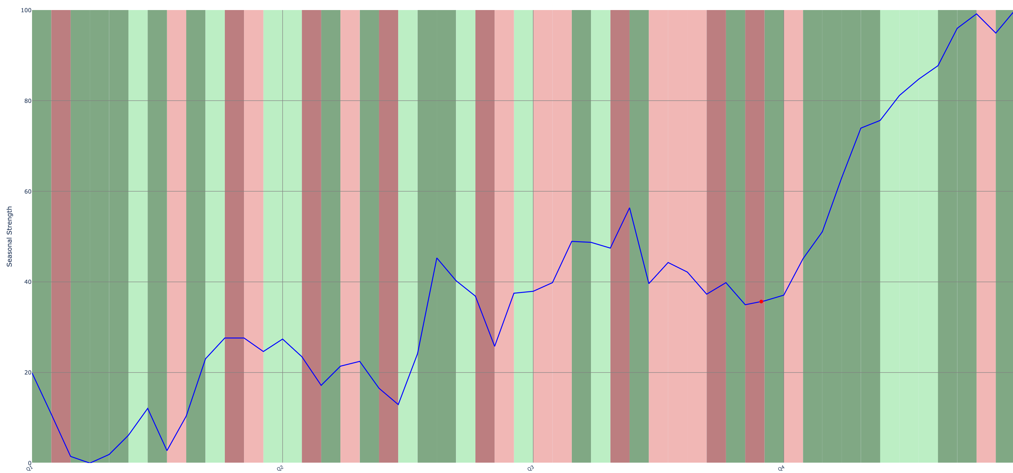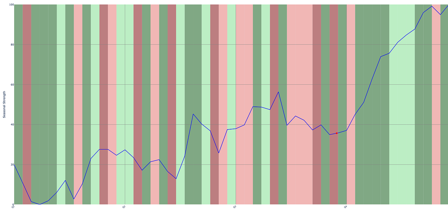 The second project, shown below, identifies the annual seasonality of an asset. The seasonal strength plot shows which weeks of the year Bitcoin typically goes up or down, with darker background shading illustrating more reliable patterns. The blue line shows the overall seasonal trend throughout the year. This image shows the seasonal patterns for Bitcoin. History suggests that we (one week before Q4) are entering the most bullish part of the year. I prioritize bullish trade ideas during consecutive weeks of dark green phases on various assets. I’ll specify these windows of time to search for seasonal trades like I mentioned in CQ6.